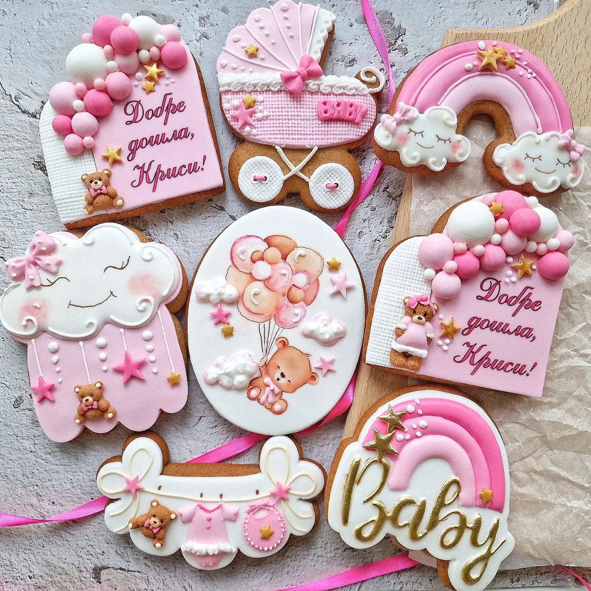 Този нежен и артистичен комплект от ръчно декорирани бисквити е създаден с много любов и внимание към всеки детайл, специално за поводи като раждане на момиченце, погача, кръщене или първи рожден ден. Бисквитите съчетават великолепна визия с фин, домашен вкус.